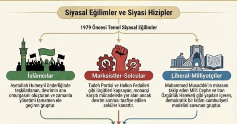 İran’daki siyasal yapının tarihsel gelişimini ve günümüzdeki siyasi hizipleri ortaya koyan çalışmaya göre, ülke siyasetinin temelleri 1979 İran Devrimi öncesindeki üç ana siyasi eğilime dayanıyor.