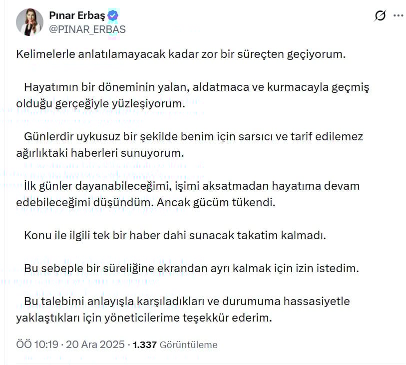 Pınar Erbaş konuyla ilgili sosyal medya hesabından şu açıklamayı yaptı: