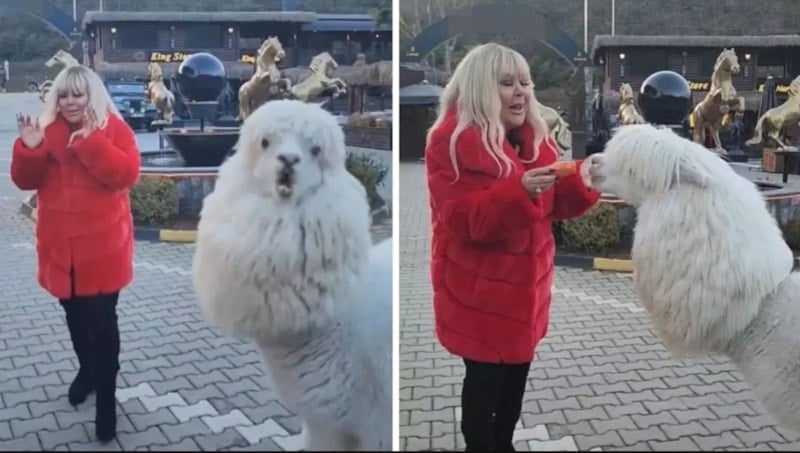 Beslemek için yanına gittiği alpaka bir anda dönerek Safiye Soyman’ın üzerine tükürdü. Kısa süreli bir şaşkınlık yaşayan Safiye Soyman, kayda alınan anları sosyal medya hesabından yayınladı.