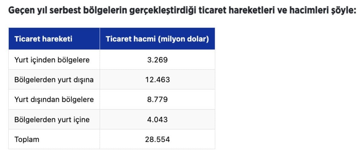 Serbest bölgelerin ticaret hacmi, 2024’te 27 milyar 691 milyon dolar olarak kayıtlara geçti. Bu ticaret hacmi, 2025’te yıllık bazda yüzde 3,1 artışla 28 milyar 554 milyon dolar oldu.