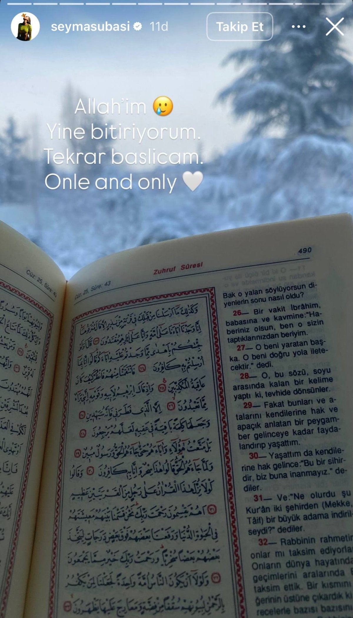 Kur’an-ı Kerim’de Zuhruf Suresi’nden bir sayfayı paylaşan Subaşı, “Allah’ım yine bitiriyorum, tekrar başlayacağım.” ifadelerini kullandı.