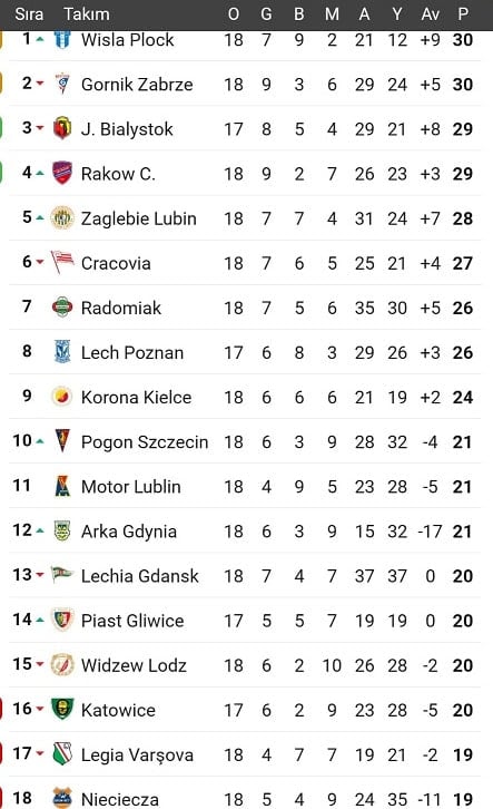 18 takımlı ligde lider ile düşme hattı arasındaki fark yalnızca 10 puan. Bu da birkaç haftalık galibiyet ya da mağlubiyet serisinin tüm sıralamayı altüst edebileceği anlamına geliyor. Ekstraklasa’da bu sezon “orta sıralar” ya da “rahat bölge” diye bir kavram kalmadı.