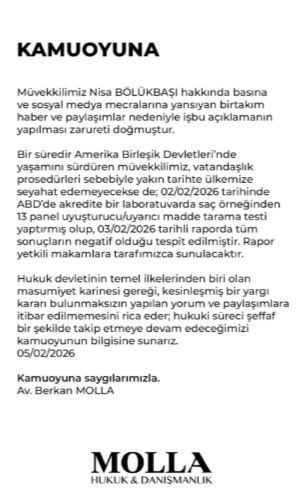 Bölükbaşı’nın avukatı Berkan Molla, “Müvekkilimiz Nisa Bölükbaşı hakkında basına ve sosyal medya mecralarına yansıyan birtakım haber ve paylaşımlar nedeniyle işbu açıklamanın yapılması zarureti doğmuştur. Bir süredir Amerika Birleşik Devletleri’nde yaşamını sürdüren müvekkilimiz, vatandaşlık prosedürleri sebebiyle yakın tarihte ülkemize seyahat edemeyecekse de; 02/02/2026 tarihinde ABD’de akredite bir laboratuvarda saç örneğinden 13 panel uyuşturucu/uyarıcı madde tarama testi yaptırmış olup, 03/02/2026 tarihli raporda tüm sonuçların negatif olduğu tespit edilmiştir. Rapor yetkili makamlara tarafımızca sunulacaktır.” açıklamasını yaptı.
