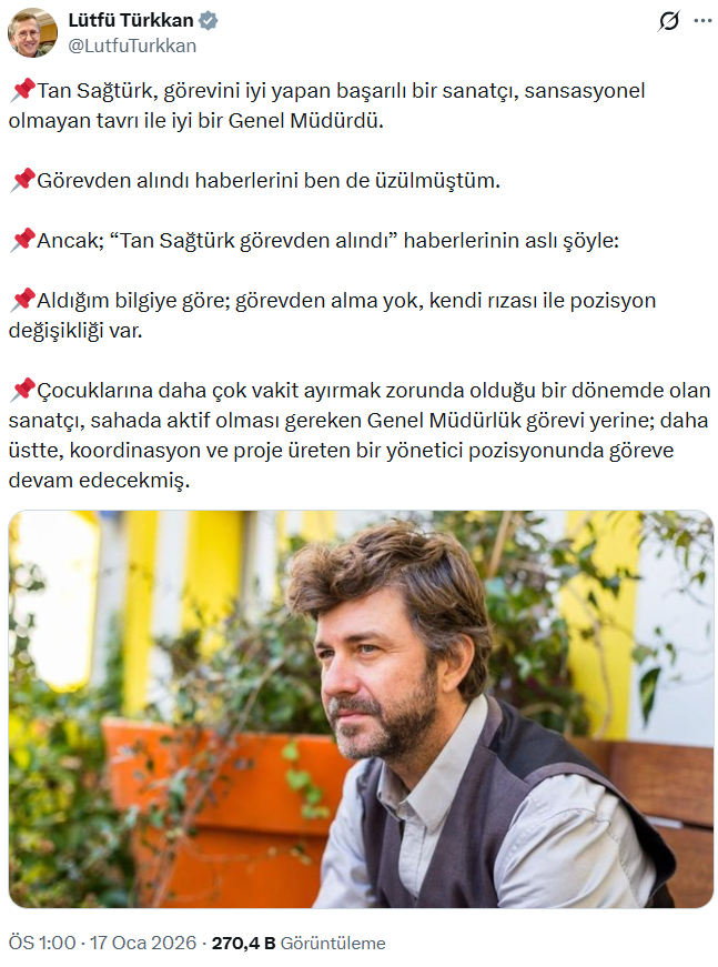 İYİ Parti Kocaeli Milletvekili Lütfü Türkkan, Tan Sağtürk’ün görev değişikliğine dair sosyal medya hesabından paylaşım yaptı.