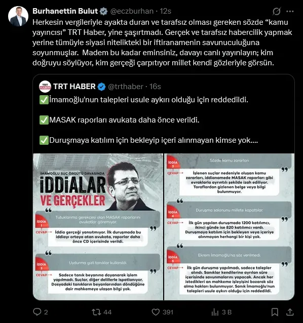 CHP Genel Başkan Yardımcısı Burhanettin Bulut, TRT Haber’in tarafsız davranması gerektiğini belirterek İBB davasının canlı yayınlanmasını istedi. Bulut, TRT’nin siyasi yayın yaptığını vurguladı.