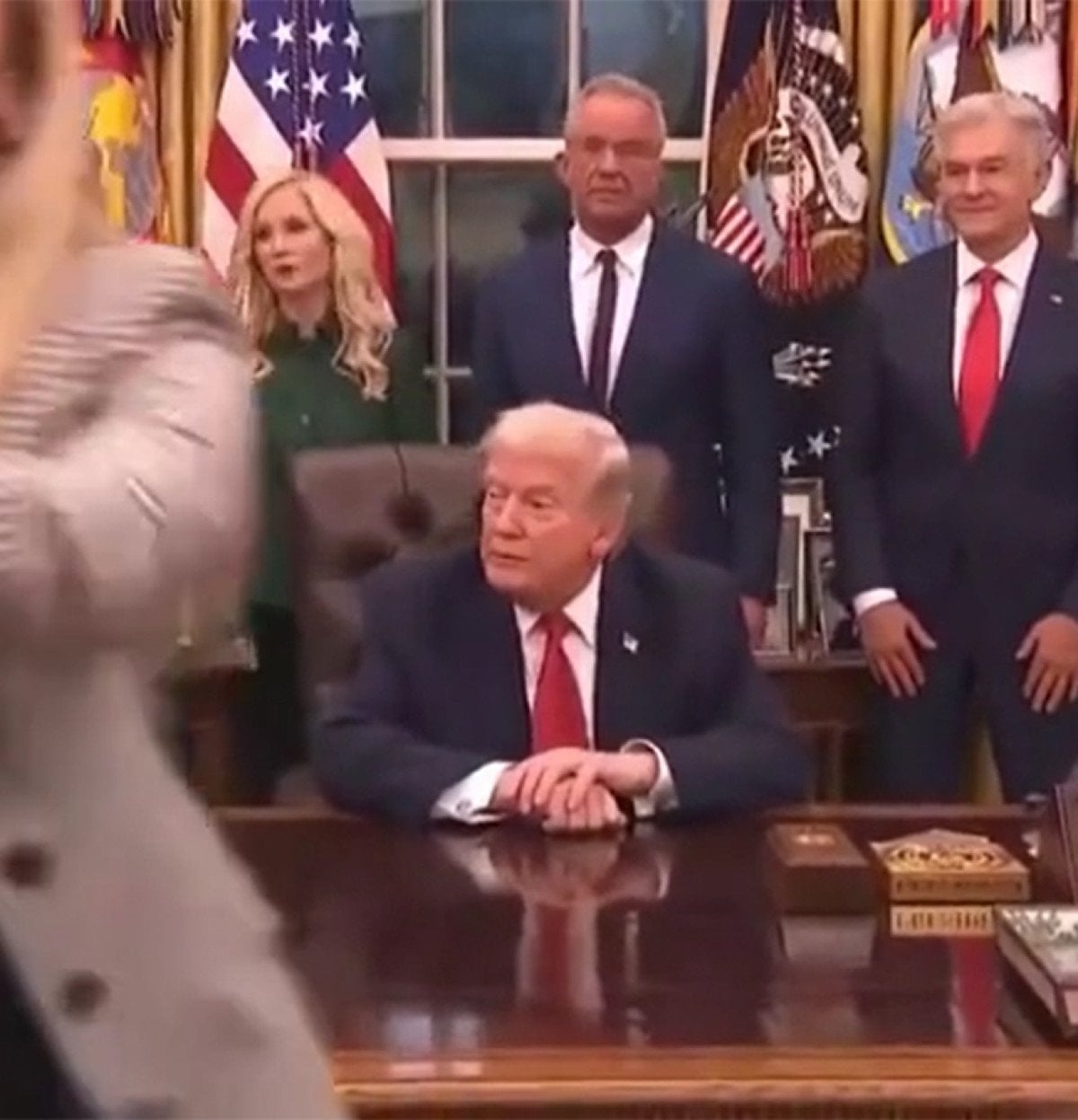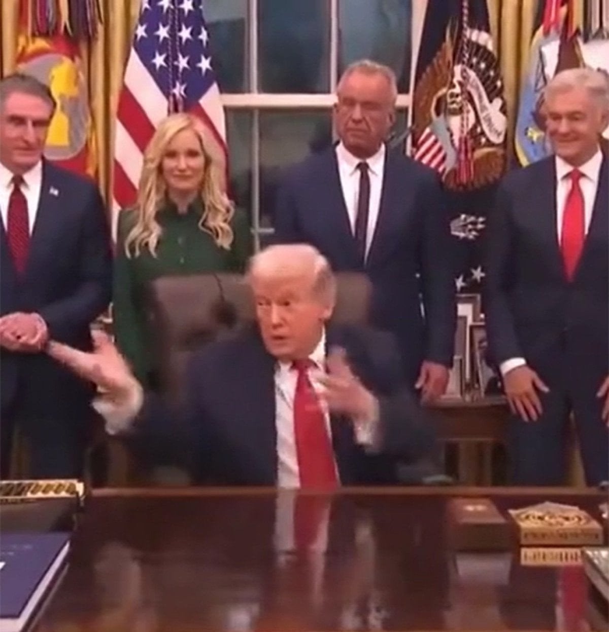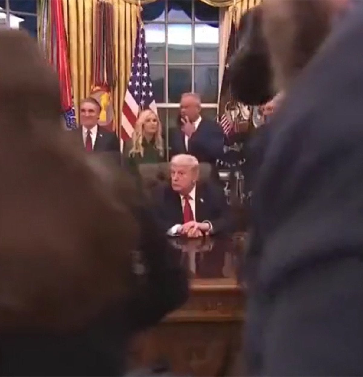 Beyaz Saray görevlilerinin müdahalesine dikkat çeken görüntülerde basın mensuplarının apar topar Oval Ofis’ten çıkarıldığı görüldü.