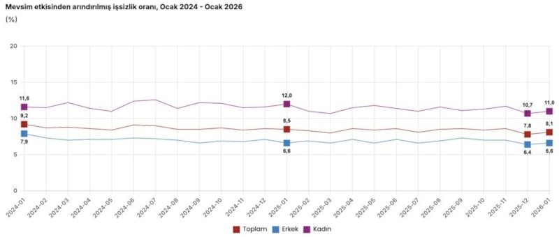 Mevsim etkisinden arındırılmış işsizlik oranı yüzde 8,1 seviyesinde gerçekleşti