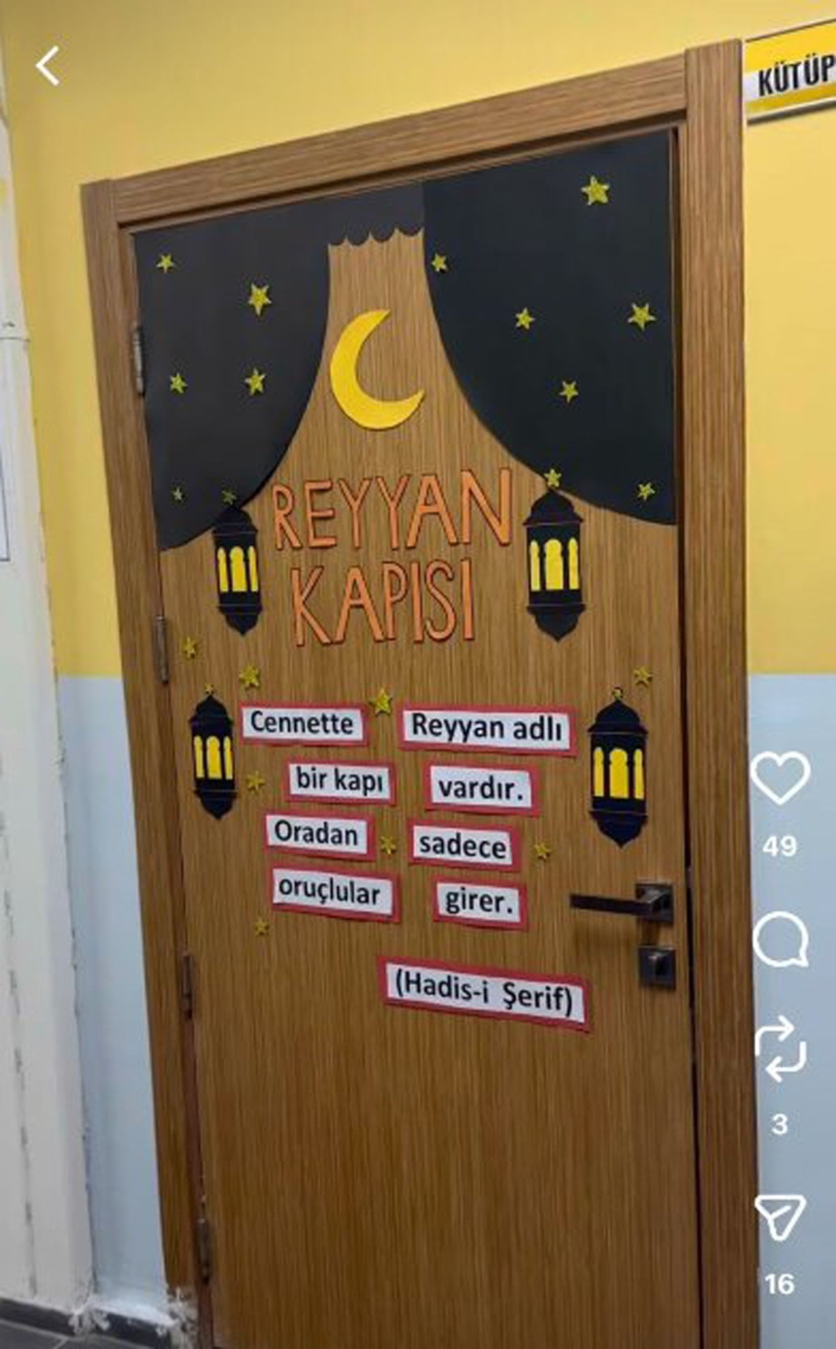 Ankara’daki Veysel Tiryaki İmam Hatip Ortaokulu’nda 5. ve 6. sınıflar için yapılan Ramazan etkinliklerinde ‘Reyyan kapısı’ kuruldu. Kapının üzerine, “Cennette Reyyan adlı bir kapı vardır oradan sadece oruçlular girer” yazıldı.