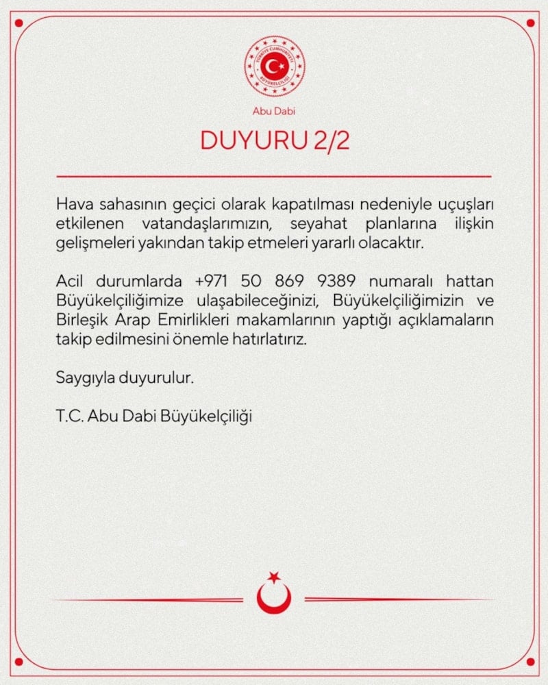 Hava sahasının geçici olarak kapatılması nedeniyle uçuşların etkilenebileceği belirtilen açıklamada, vatandaşların seyahat planlarını yakından takip etmeleri önerildi. Acil durumlarda ise +971 50 869 9389 numaralı hattan Büyükelçiliğe ulaşılabileceği bildirildi.