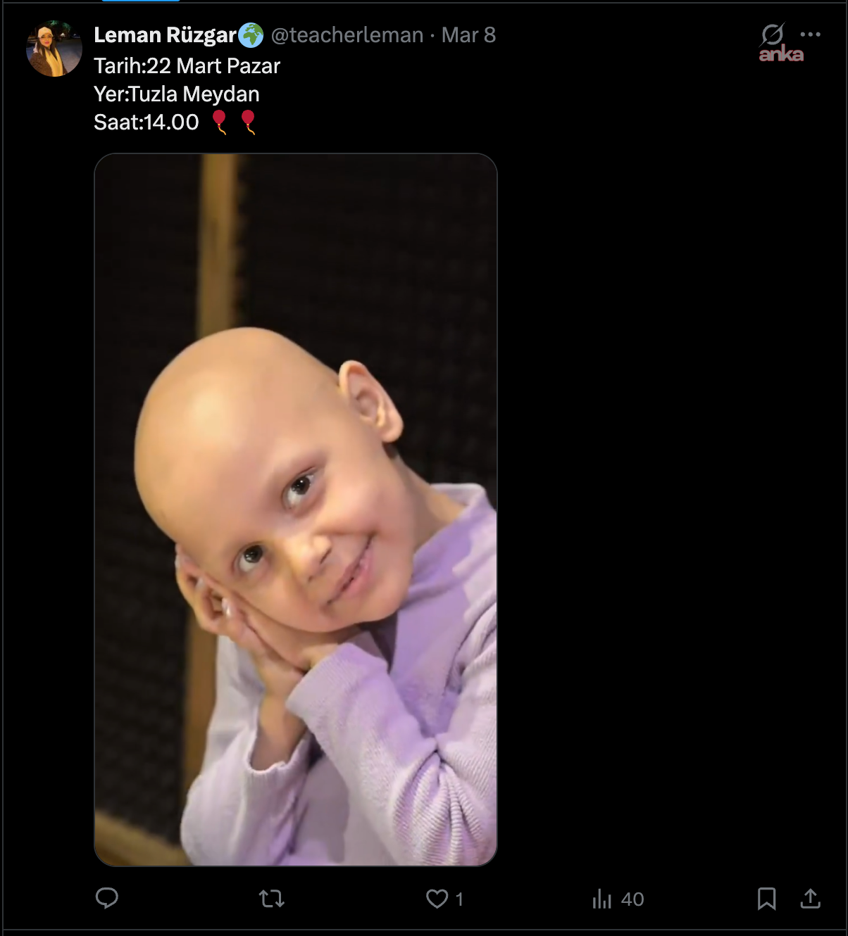 Tedavi sürecini başarıyla tamamlayan Almira, Tuzla’da balon uçurmak istediğini dile getirdi. Almira’nın bu isteği üzerine Tuzla Belediyesi de özel bir etkinlik organize etti. Almira’nın annesi Leman Rüzgar, sosyal medya platformu X’ten yaptığı paylaşımda Belediye Başkanı Eren Ali Bingöl ve Tuzla Belediyesi’ne seslenerek, “Balonlar bu sefer Almira için 22 Mart’ta Tuzla Meydanı’nda uçuyor. Almira kanseri yendi. Doğum gününde bir balon ile bize eşlik eder misiniz?” dedi.