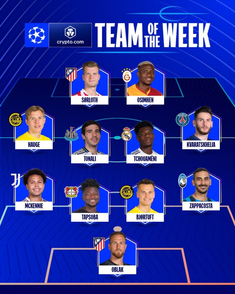 Oblak, Zappacosta, Bjortuft, Tapsoba, McKennie, Thcouameni, Tonali, Kvaratskheila, Hauge, Osimhen, Sörloth
