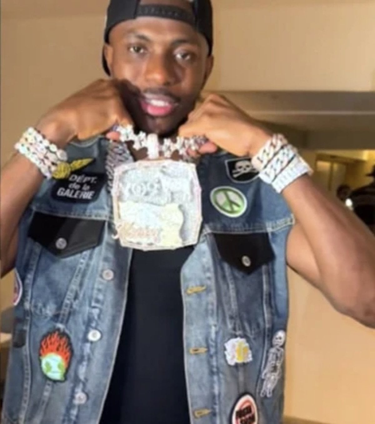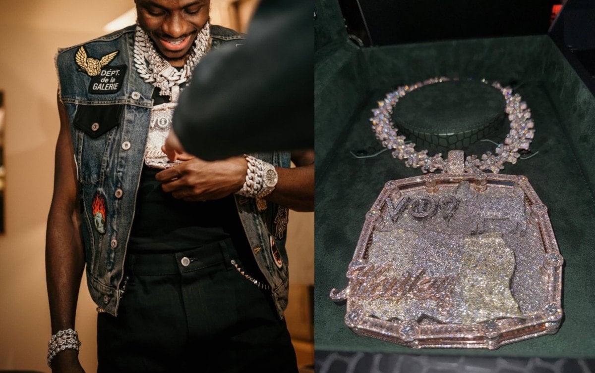 Kolyede, Nijerya bayrağının renkleri, “VO9” baş harfleri ve “GOAT” (Tüm Zamanların En İyisi) ifadesini simgeleyen bir figür yer alıyor.