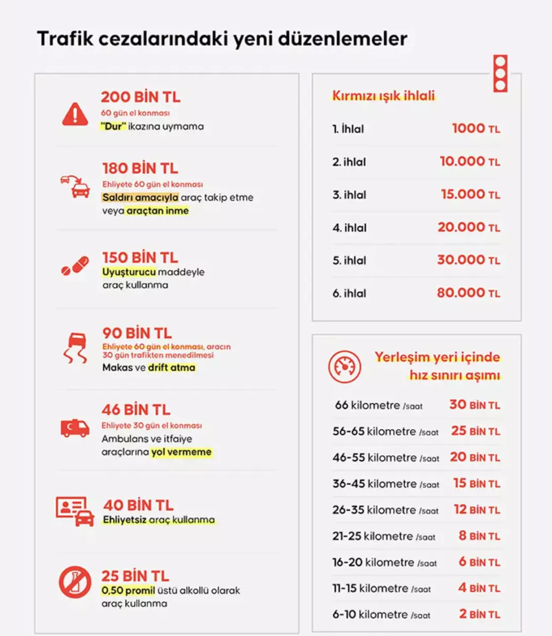 Trafik Kanunu’nda yapılan son değişikliklerle birlikte kırmızı ışık ihlali, makas atma, drift yapma, alkollü veya ehliyetsiz araç kullanma gibi ihlallerde uygulanan para cezaları ciddi oranda artırıldı.
