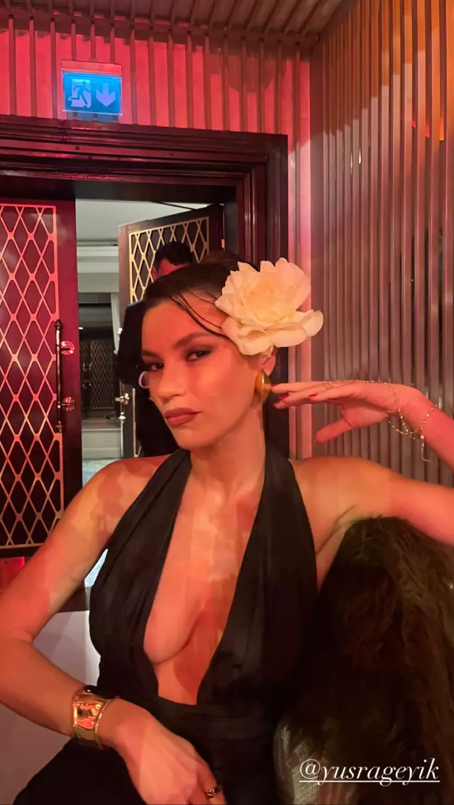Ünlü oyuncu, düğünde nikah şahidi olarak da görev alarak arkadaşına bu özel gününde destek verdi. Geyik, düğünde giydiği siyah elbisesi ve göğüs dekoltesiyle dikkatleri üzerine çekti.