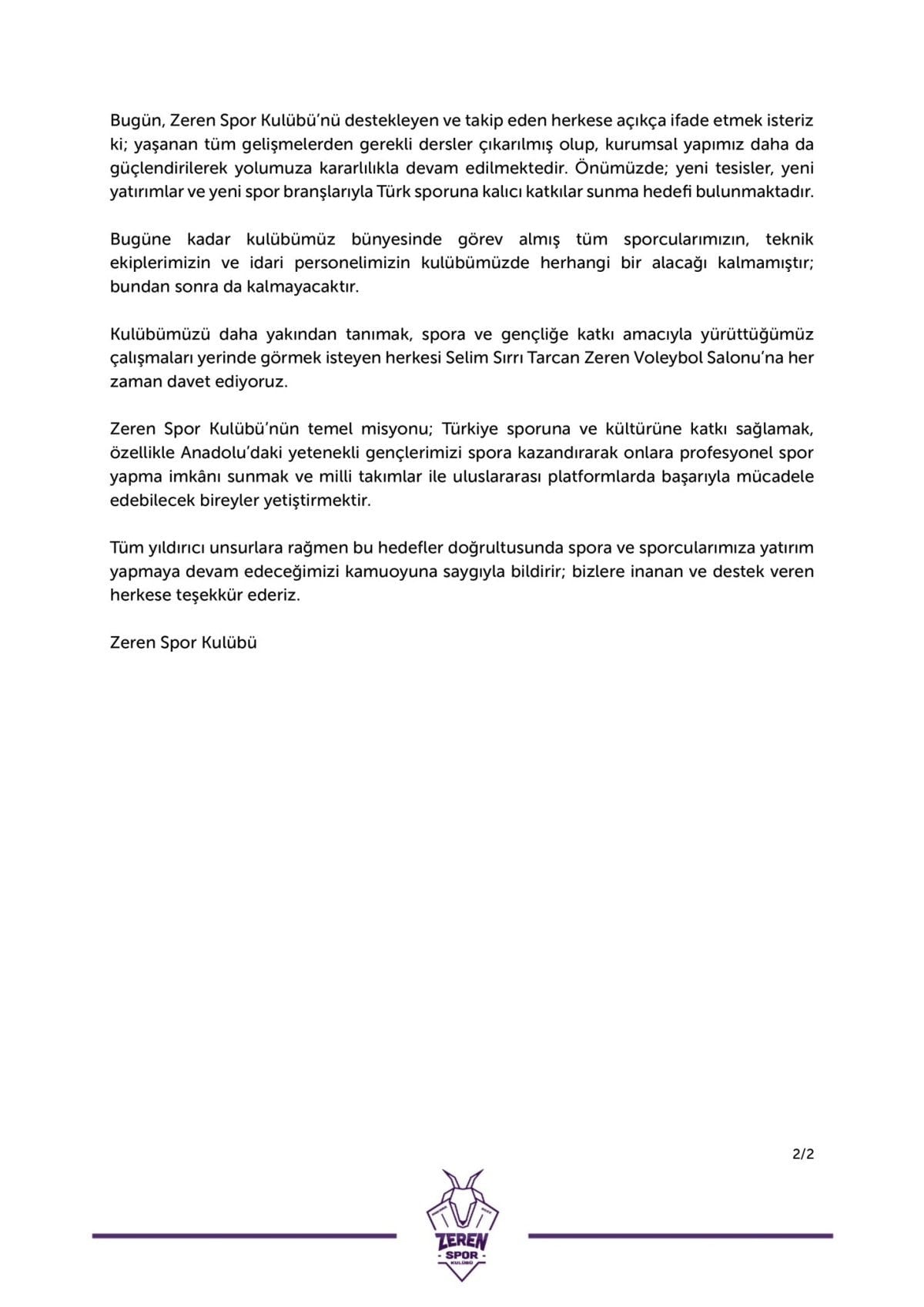 Yaşanan tüm gelişmelerden gerekli dersler çıkarılmış olup kurumsal yapımız daha da güçlendirilerek yolumuza kararlılıkla devam edilmektedir. Önümüzde yeni tesisler, yeni yatırımlar ve yeni spor branşlarıyla Türk sporuna kalıcı katkılar sunma hedefi bulunmaktadır. Bugüne kadar kulübümüz bünyesinde görev almış tüm sporcularımızın, teknik ekiplerimizin ve idari personelimizin kulübümüzde herhangi bir alacağı kalmamıştır, bundan sonra da kalmayacaktır.