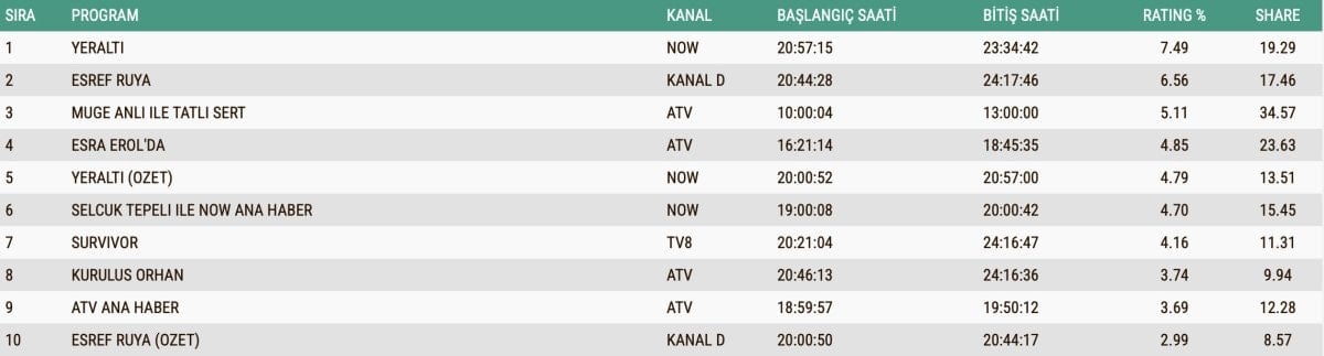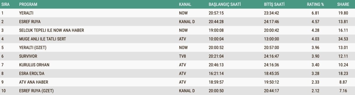 Peki, dün akşam en çok ne izlendi? Eşref Rüya mı, Yeraltı mı?